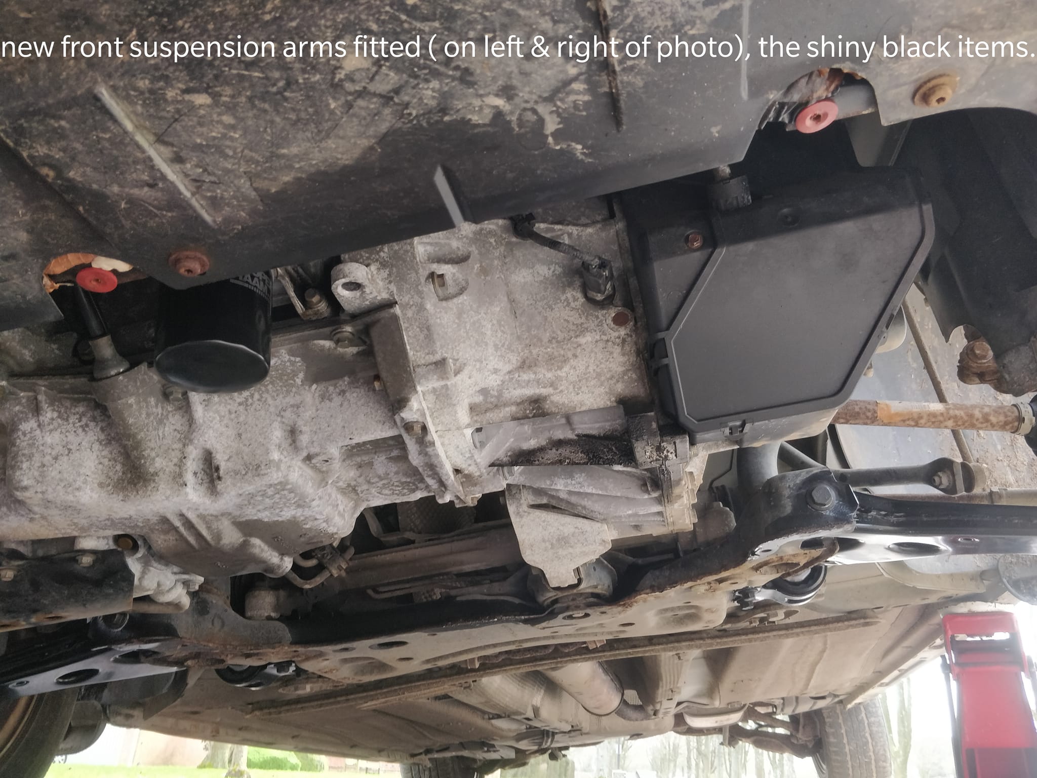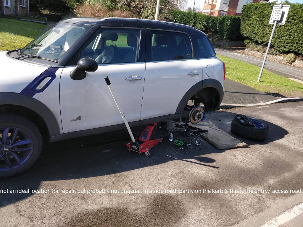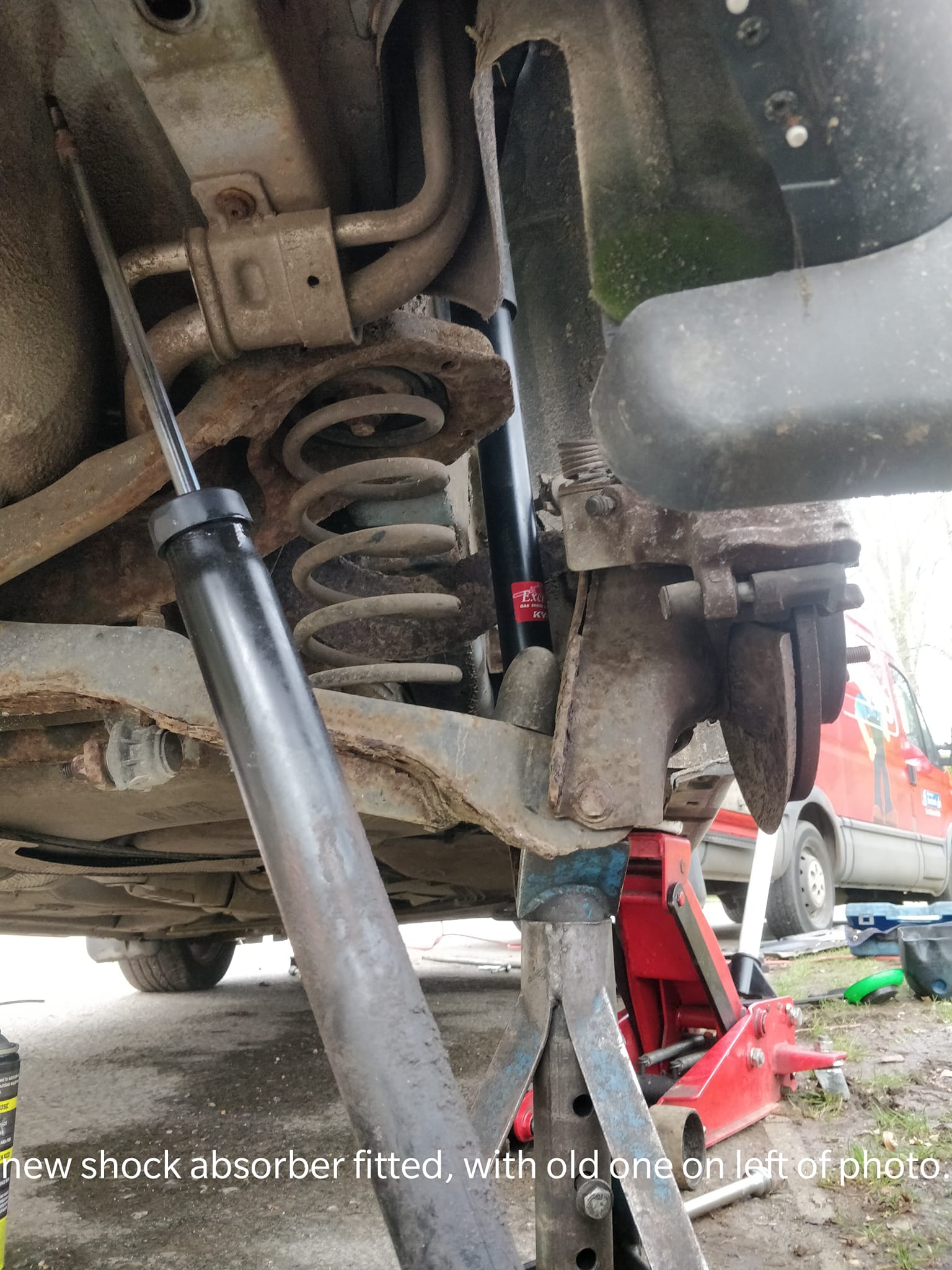 Lucky with the weather today ( forecast rain). Carrying out MOT repairs today. Both front suspension arms( old ones had badly worn rear mounting bushes) & a rear shock absorber ( old one was leaking fluid), so not efficient.
